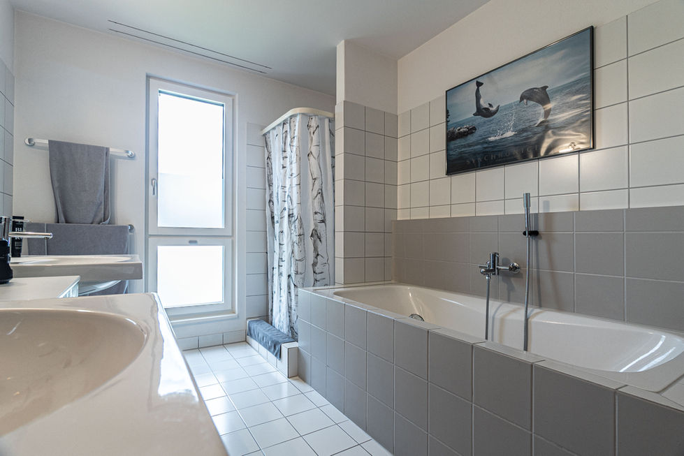 Dieses Badezimmer vereint klare Linien, natürliche Materialien und moderne Eleganz zu einem zeitlosen Wohlfühlort. Die harmonische Kombination aus warmem Holz, stilvollen Oberflächen und großzügiger Raumgestaltung schafft ein Ambiente, das jeden Tag wie einen Kurzurlaub wirken lässt.
